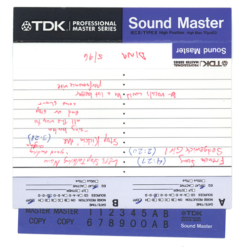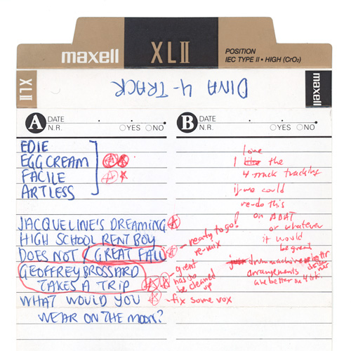 Dina gave us two cassette tapes of her four-track home recordings in the Spring of 1996 (pictured here), and the project was penciled in as Teen-Beat 209, though never realised for reasons we cannot remember.